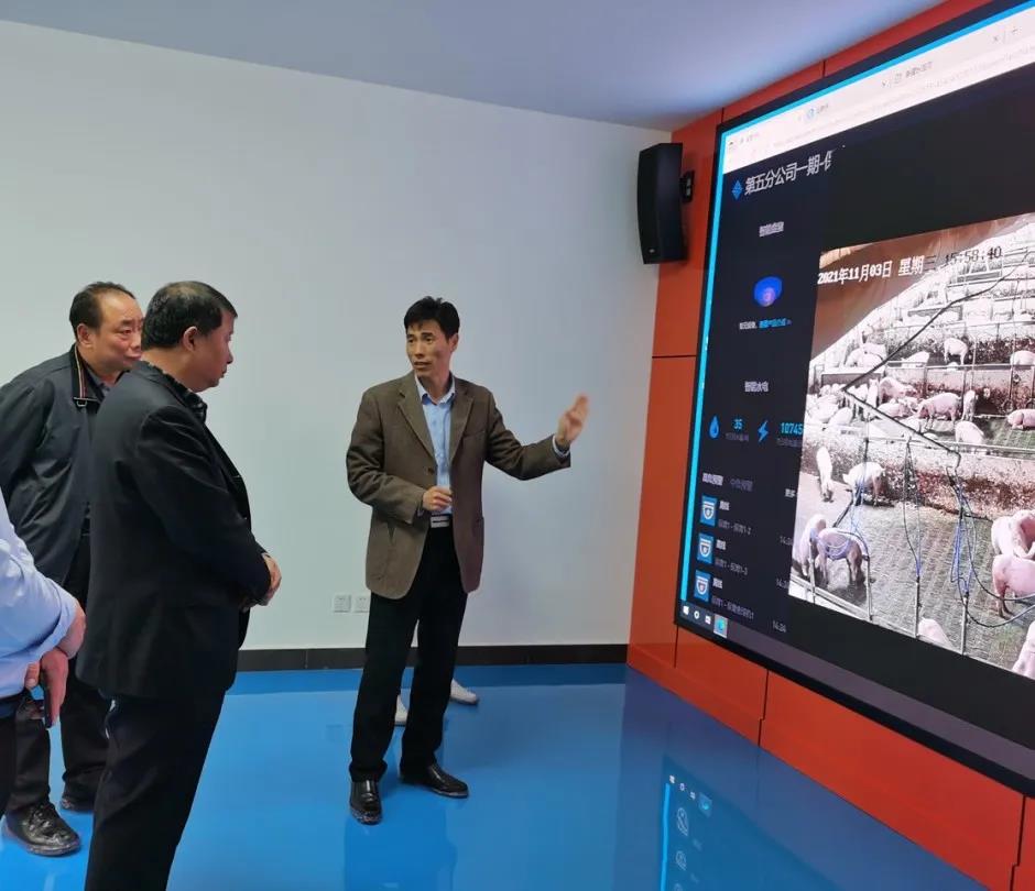 劉軍一行深入公司生豬產(chǎn)業(yè)技術(shù)中心,詳細(xì)了解了中心通過AI巡檢、智能環(huán)控、智能能耗、精準(zhǔn)飼喂、智能盤估、生產(chǎn)數(shù)據(jù)平臺(tái)等實(shí)現(xiàn)豬場遠(yuǎn)程可視化的管理模式,現(xiàn)場聽取了生豬疫病檢測(cè)中心工作情況及未來規(guī)劃的匯報(bào)。